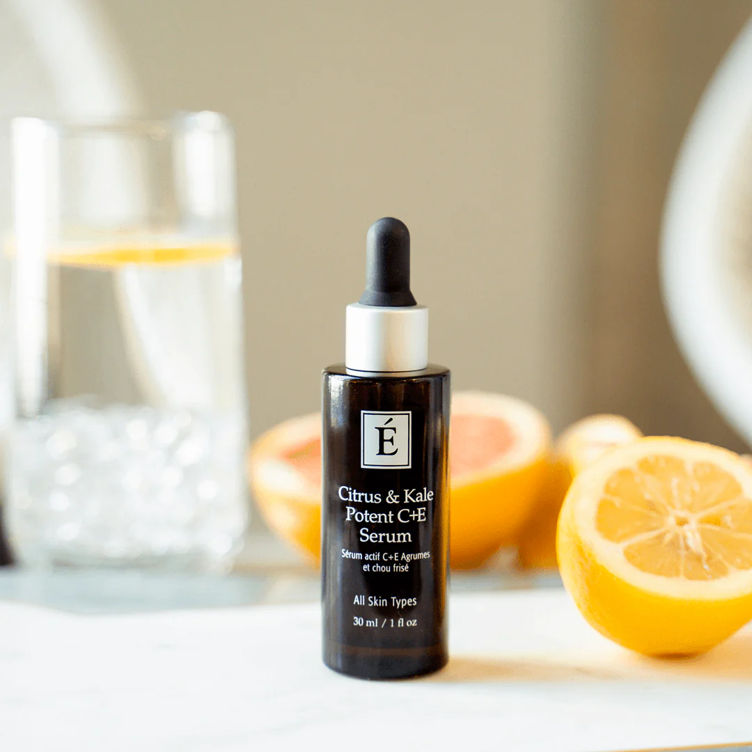 Eminence Organics Citrus & Kale Potent C+E Serum provides a potent dose of Vitamin C (16%) that is stabilized by botanically derived ferulic acid to deliver optimal antioxidant benefits and increase collagen production. Vitamin E and leafy greens such as kale and spinach provide additional protection to the Vitamin C blend while healing and repairing the skin for improved skin tone and elasticity, The lipid base of the formulation means that these ingredients, as well as the collagen boosting, hydrolyzed hyaluronic acid are easily absorbed into the skin. Prevent free radical damage and reduce inflammation with this skin-perfecting super serum that is gentle enough for all skin types.Â