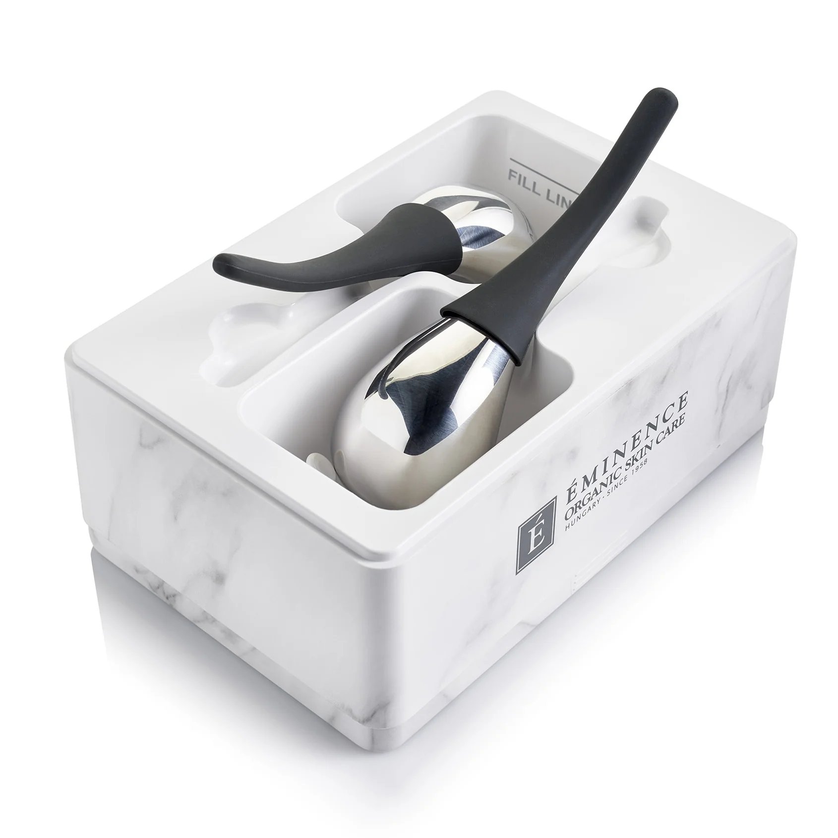 Elevate your skincare ritual with the Eminence Organics Cryo-Thermal Sculpting Tool, a set of ergonomic stainless-steel facial massage spoons designed for both warming and cooling treatments. Each spoon is fitted with custom silicone sleeves for a comfortable, controlled grip, while the included tray allows you to conveniently heat or cool the spoons and store them when not in use. Glide the spoons upward along the natural contours of the face to relax, refresh, and revitalize your complexion. Use them warm to ease facial tension, encourage circulation, and reveal a healthy radiance, or chilled to help reduce puffiness, calm the skin, and restore balance. For a complete sculpting experience, alternate between warm and cool therapy to visibly tone, smooth, and awaken the skin.