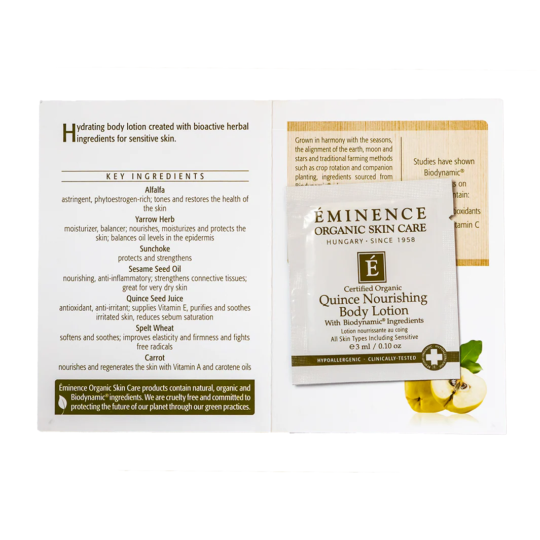 Eminence Organics Quince Nourishing Body Lotion is a hydrating body lotion that soothes irritated and sensitive skin with bioactive herbal ingredients such as alfalfa extract, sunchoke and sesame seed oil to leave skin velvety soft. Supplements skin moisture balance, assists in smoothing skin texture, minimizes irritation and itchiness on the body.